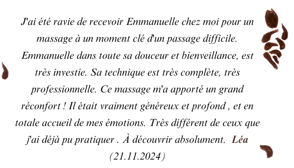 Mon intention pour le temps du massage est de vous aider à retrouver le chemin vers votre espace de ressourcement, lié au système nerveux autonome (afflux des fluides vers la récupération, la réparation, l’homéostasie, etc…).