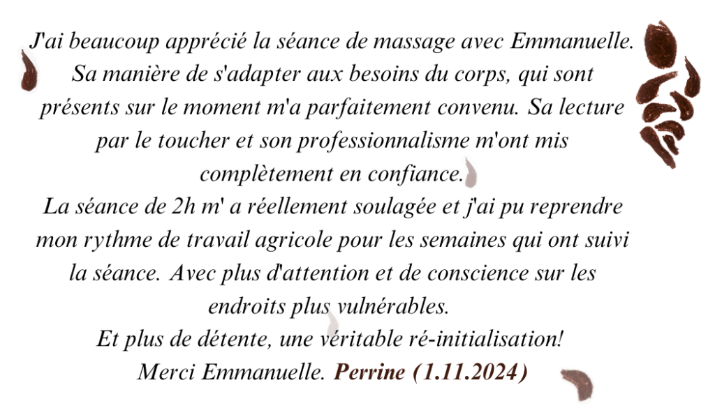 Je le conçois donc comme un accompagnement qui se dessine, dans les proportions que vous souhaitez : entre un temps de plongée dans le système nerveux parasympathique (espace de ressourcement – le massage ) et des prises de consciences, qui ponctuent le chemin, instants d’éveil, pour soutenir de nouveaux appuis au quotidien (accompagnement somatique).